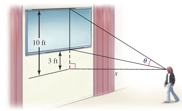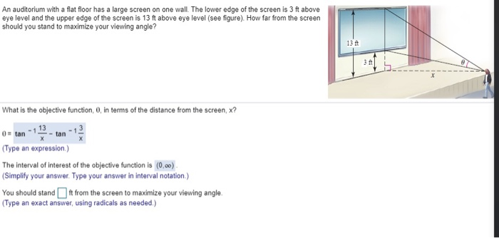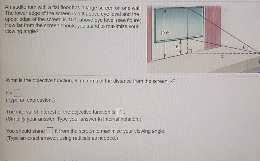 Solved Viewing Angles An Auditorium With A Flat Floor Has A Large Screen On One Wall The Lower Edge Of The Screen Is 3 Ft Above Eye Level And The Upper Edge Of